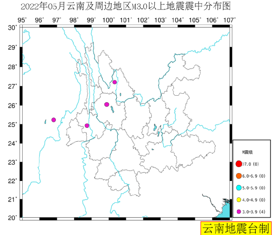 2022年05月云南及周边地震活动概况:云南及周边地区(北纬20°~30°,东经96°~107°)共发生地震2087次。按M统计,其中M2.0~2.9级29次、M3.0~3.9级6次,该区域和省内最大地震均为05月06日05时10分云南洱源M3.4级地震。(注:M为国家标准震级)