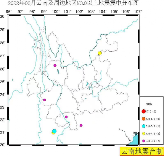 2022年06月云南及周边地震活动概况:云南及周边地区(北纬20°~30°,东经96°~107°)共发生地震1555次。按M统计,其中M2.0~2.9级42次、M3.0~3.9级7次、M4.0~4.9级2次、M5.0~5.9级1次,该区域最大地震为06月30日02时54分缅甸M5.0级地震,省内最大地震为06月01日16时21分云南洱源M3.8级地震。(注:M为国家标准震级)