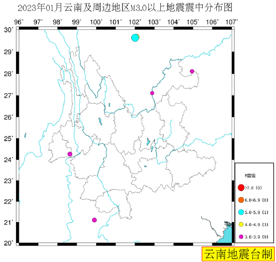 2023年01月云南及周边地震活动概况:云南及周边地区(北纬20°~30°,东经96°~107°)共发生地震1302次。按M统计,其中M3.0~3.9级9次、M4.0~4.9级3次、M5.0~5.9级1次,该区域最大地震为01月26日03时49分四川泸定M5.6级地震,省内最大地震为01月09日20时51分云南芒市M3.4级地震。(注:M为国家标准震级)